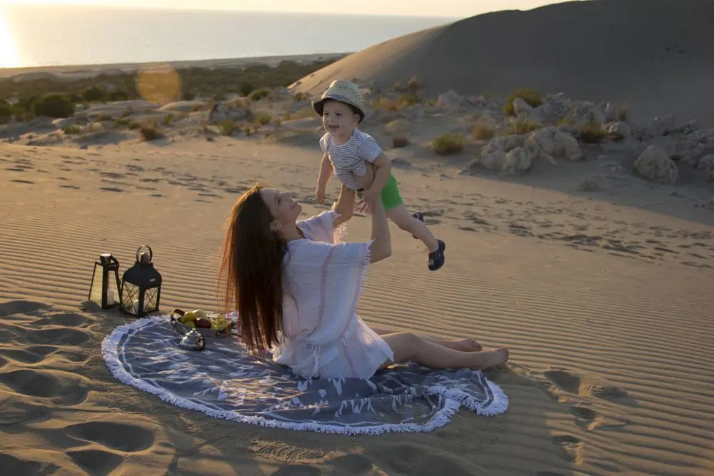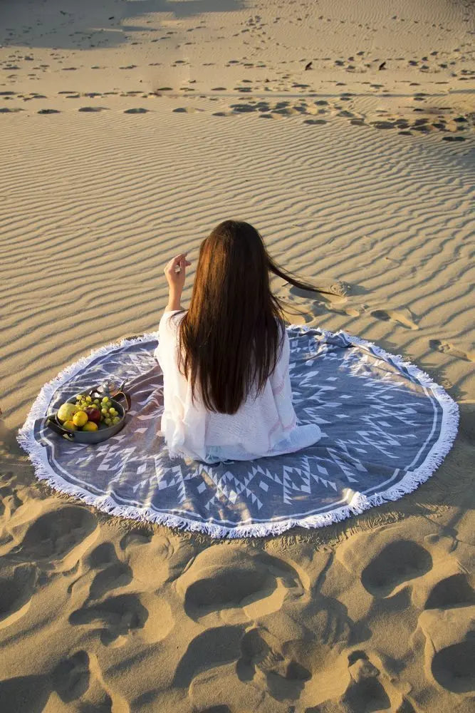 Kilim är en rund badlakan som passar perfekt för en dag på stranden, till utflykten, som pläd, eller som inredningsdetalj i hemmet. Den rymmer minst 2 vuxna och 3 småbarn.