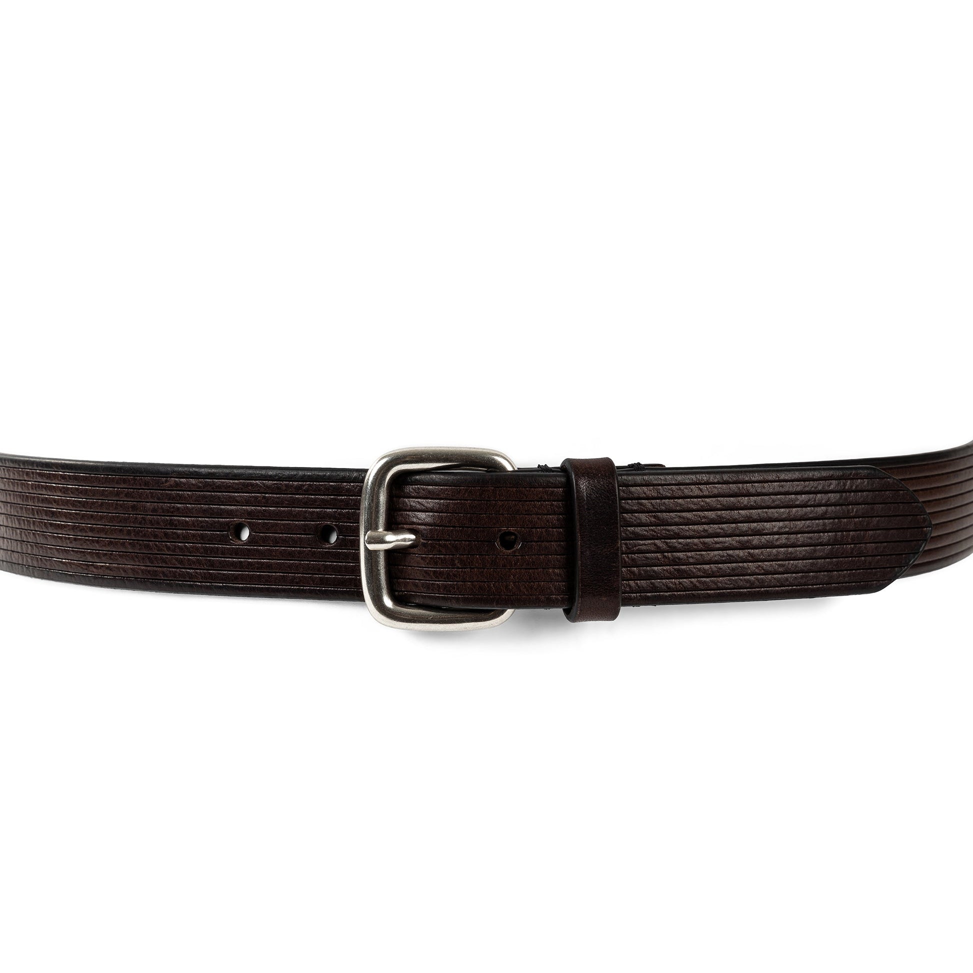 Läderbälte med präglad randig struktur som ger ett genomarbetat uttryck. Bältet har behandlade kanter och spänne i ljus silverfärgad metall med rundade former. Det vegetabiliska garvade, anilinfärgade narvlädret åldras naturligt med tiden, och kommer att variera i färg och ytstruktur. Bältet fungerar utmärkt både till kostym och jeans.