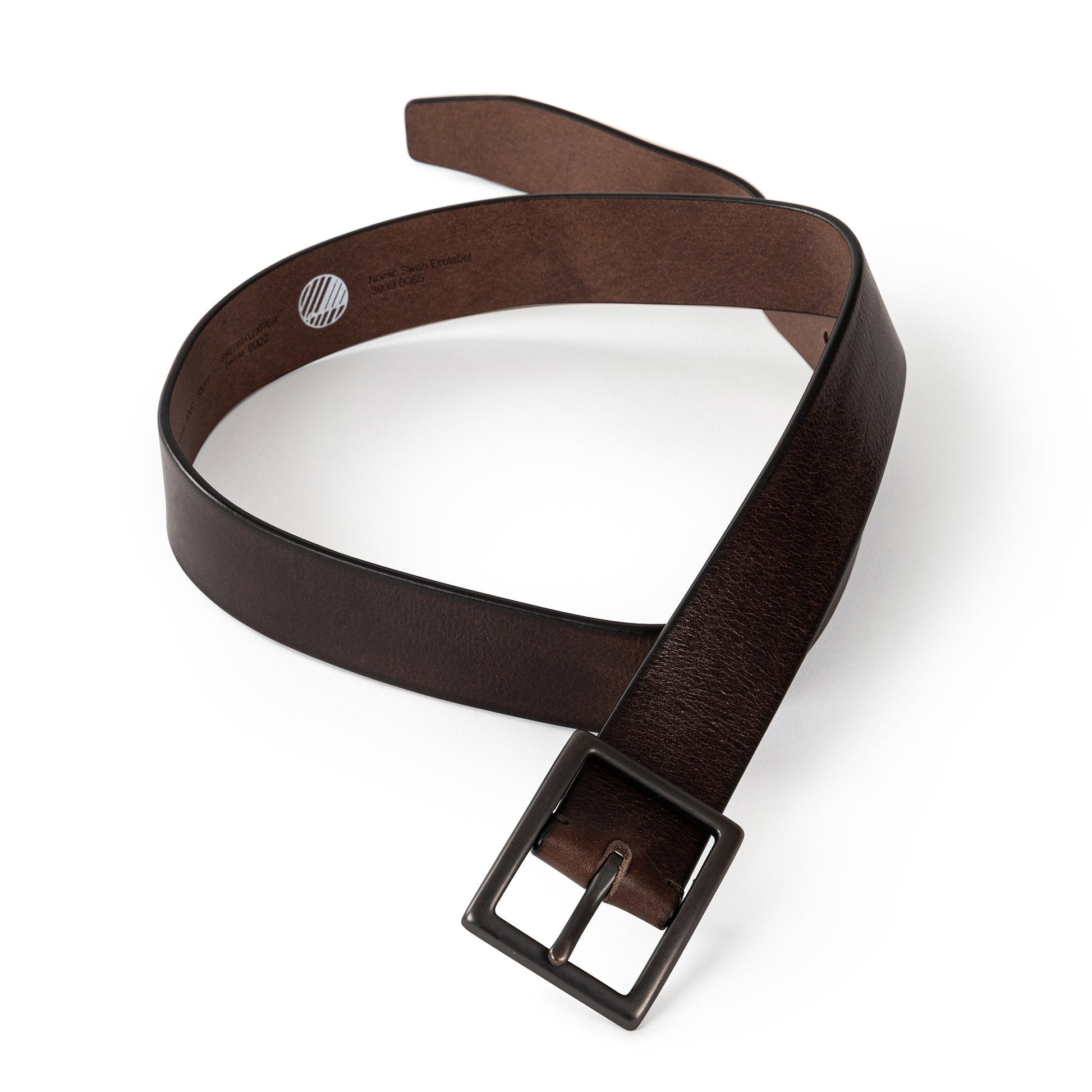 Ett stadigare, klassiskt läderbälte med markerade kanter och ett öppet, brett spänne i oxiderad metall. Den maskulina färgtonen passar utmärkt till jeans. Det vegetabiliskt garvade, anilinfärgade narvlädret åldras naturligt med tiden och kommer att variera i både färg och yta.