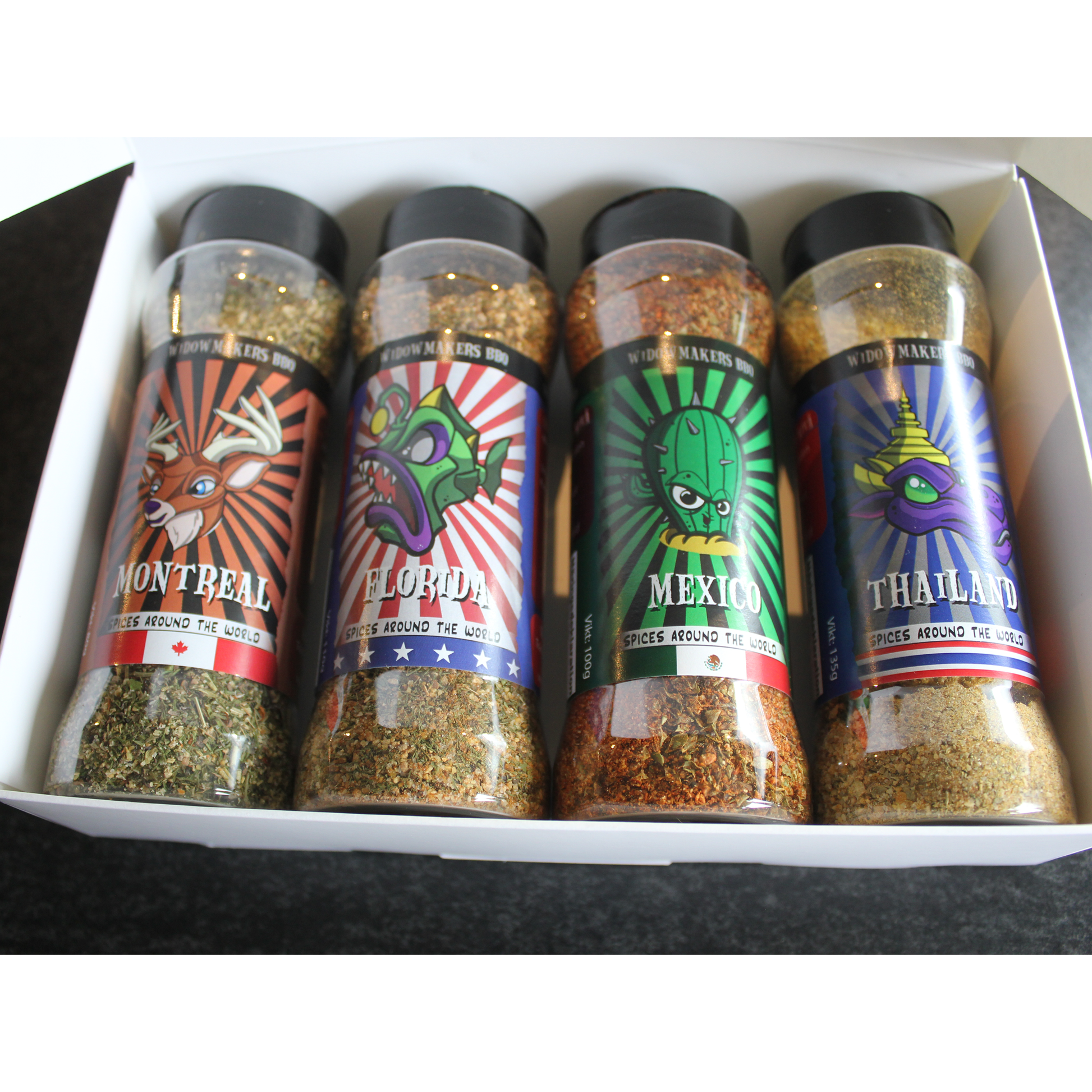 Presentförpackning från Widowmakers BBQ som innehåller de fyra kryddblandningarna (via länklistan kan du köpa kryddblandningarna separat och få mer tips på recept och vad respektive krydda passar till bäst):